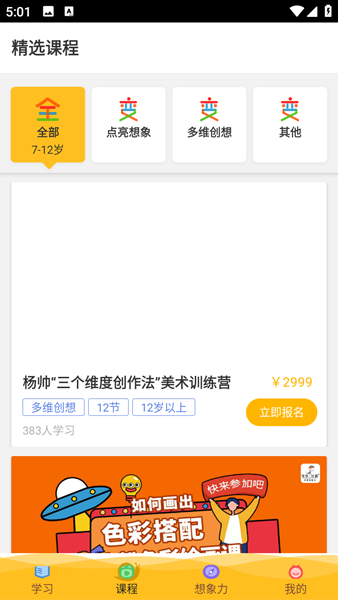 1、切换课程页面,浏览思维艺术、通识艺术、学科艺术三大类,选择目标课程报名。